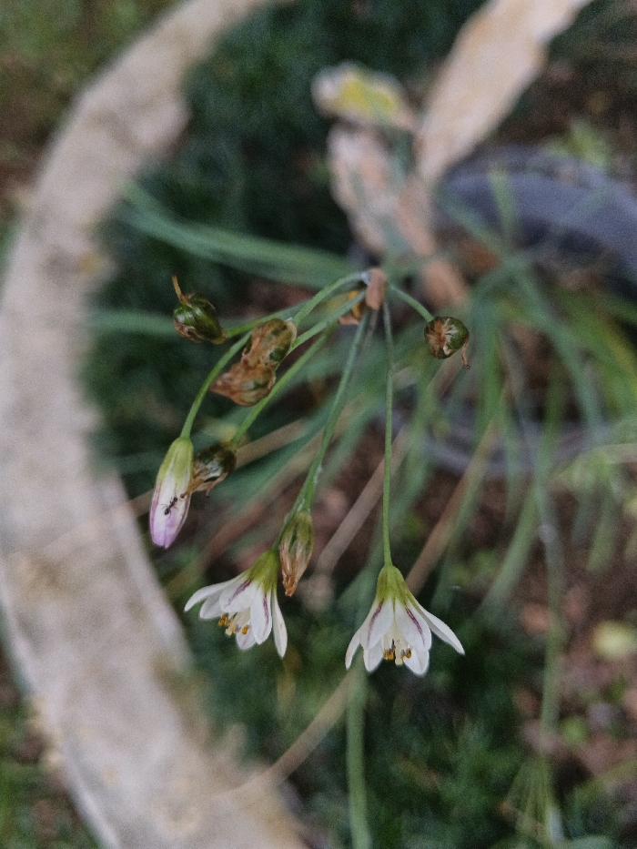 This close-up image, captured in São Félix do Xingu, Brazil, presents a cluster of bell-shaped flowers and buds. The primary subjects include two open flowers, each displaying white petals with faint purplish-red vertical striations and prominent yellow anthers, all suspended from slender green pedicels. Multiple buds in various stages of development are present; some are green and intact, while others exhibit signs of desiccation, appearing withered and brown. A single, dark-bodied ant is observed stationary on the surface of a pale purple-tipped bud located on the left side of the central flower cluster. The immediate environment comprises blurred green foliage in the background, suggesting an outdoor, vegetated setting. A light-colored, out-of-focus curvilinear object is partially visible in the lower-left foreground. No human presence is depicted.
