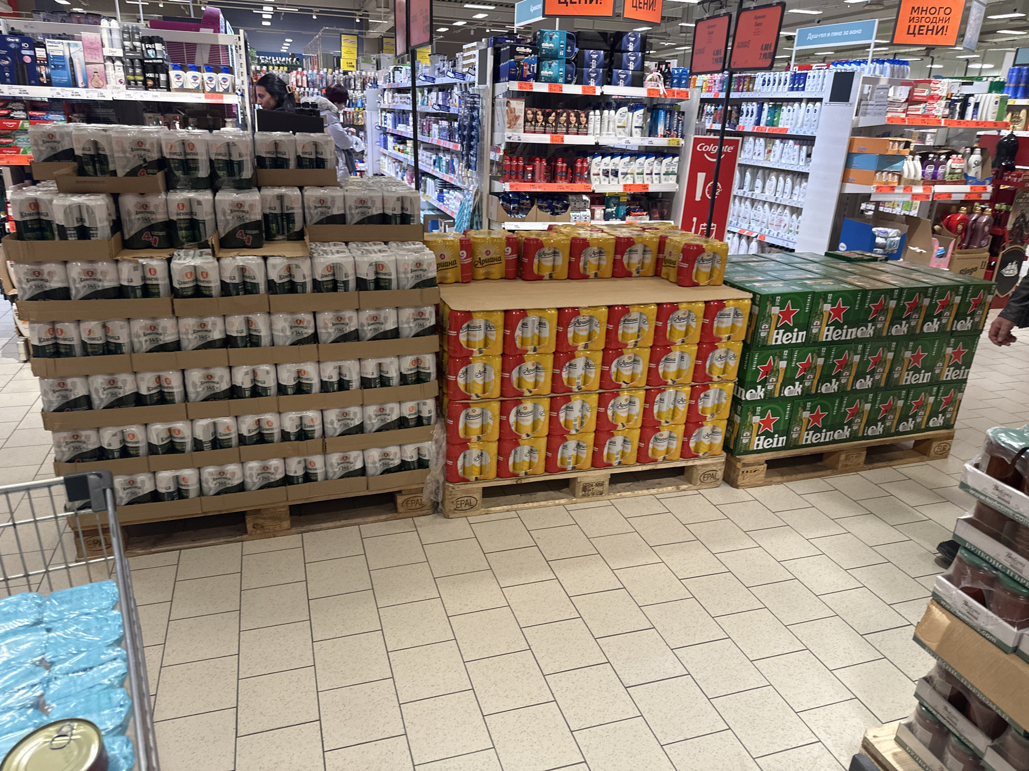 The image depicts an interior view of a supermarket aisle in Shumen, Bulgaria. In the mid-ground, three large displays of packaged beer are arranged on wooden EPAL pallets. From left to right, these include multiple layers of Kamenitza beer in white six-packs, Ariana beer in red and yellow six-packs, and Heineken beer in green six-packs. To the far left, a silver shopping cart contains blue-wrapped items and a gold-colored can. To the far right, a stack of glass jars in cardboard boxes is partially visible on a wooden pallet, and a human right arm and hand are present near the top of this stack. In the background, two individuals are visible browsing merchandise along brightly lit shelves. One person with dark hair, wearing a dark top, stands on the left, looking towards the shelves. Another person in a light-colored jacket is further back on the right. The shelves are extensively stocked with various personal care products, including shampoos, deodorants, toothpaste, razors, and hair dyes, from brands such as Philips, Dove, Colgate, and Gillette. Overhead, red and orange signs with white Bulgarian text, including "ЦЕНИ!" (Prices!) and "МНОГО ИЗГОДНИ ЦЕНИ!" (Very good prices!), are suspended. The floor is covered with light-colored, square tiles.