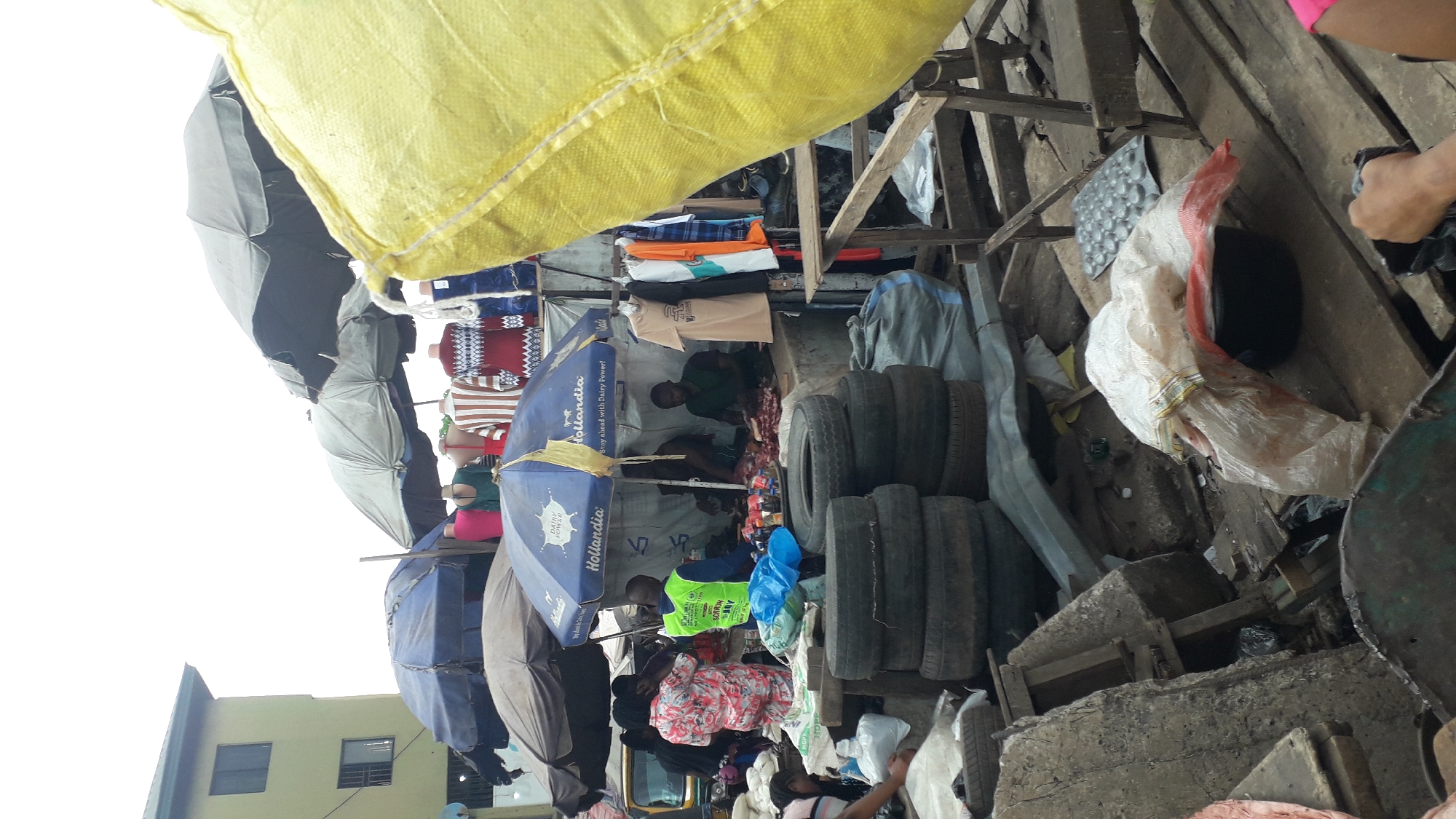 The image depicts a bustling street scene in Onitsha, Nigeria, characterized by market stalls and vendors. A yellow bag dominates the upper part of the frame, obscuring the view above. Below, vendors are seen amidst merchandise displayed under umbrellas, some bearing "Hollandia" branding. The stalls showcase clothing, including sweaters and t-shirts, as well as tires. Concrete debris and wooden structures suggest the infrastructure of a busy marketplace. People are visible, some interacting within the stalls. A building with green window frames is visible in the distance, indicating an urban setting. The image captures the dense, active environment typical of Onitsha's markets.