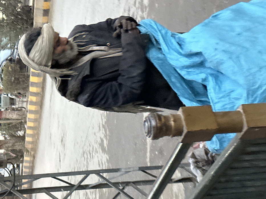 An elderly individual, likely male, is depicted standing outdoors on a damp paved surface in Quetta City Tehsil, Pakistan. The person wears a light-colored turban or headwrap, a dark coat with a fur-lined collar, and dark gloves. Grey dreadlock-like strands are visible extending from beneath the head covering. The individual's head is bowed, focusing on a large, bright blue fabric object, possibly a tarp or bag, which they are actively manipulating with both gloved hands. To the immediate left, a metal railing with a brass-colored finial is partially visible in the foreground. In the background, a street with a yellow and black striped curb is present, along with parked vehicles and sparse vegetation under an overcast sky.