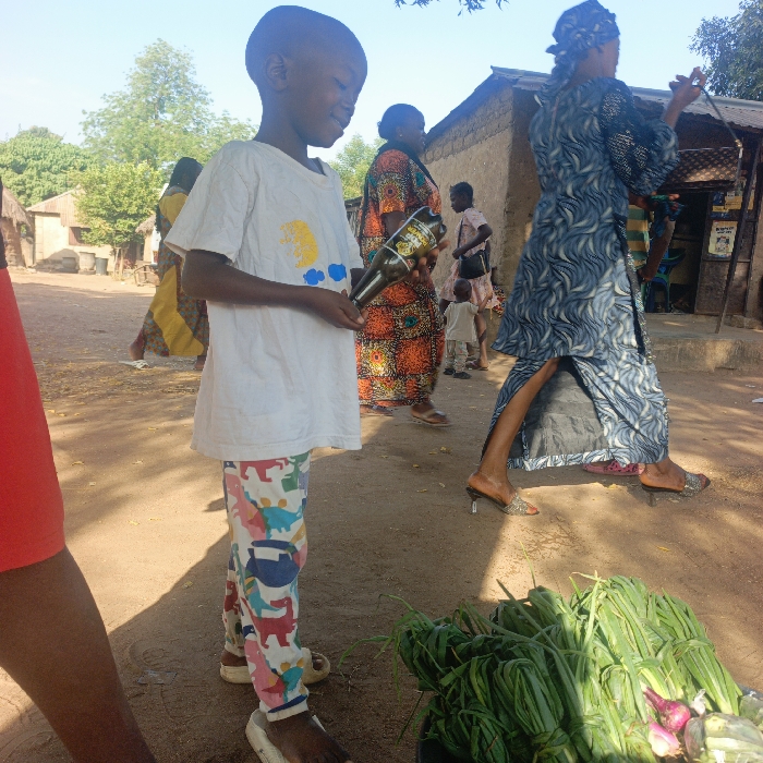 A young boy in a white t-shirt and colorful dinosaur pants holds a glass bottle on a sandy path. He's surrounded by people, some wearing traditional African clothing. In the foreground, bundled green onions lie near the bottom of the frame. A woman in a blue patterned dress and heels walks past. Houses and trees populate the background, bathed in sunlight.