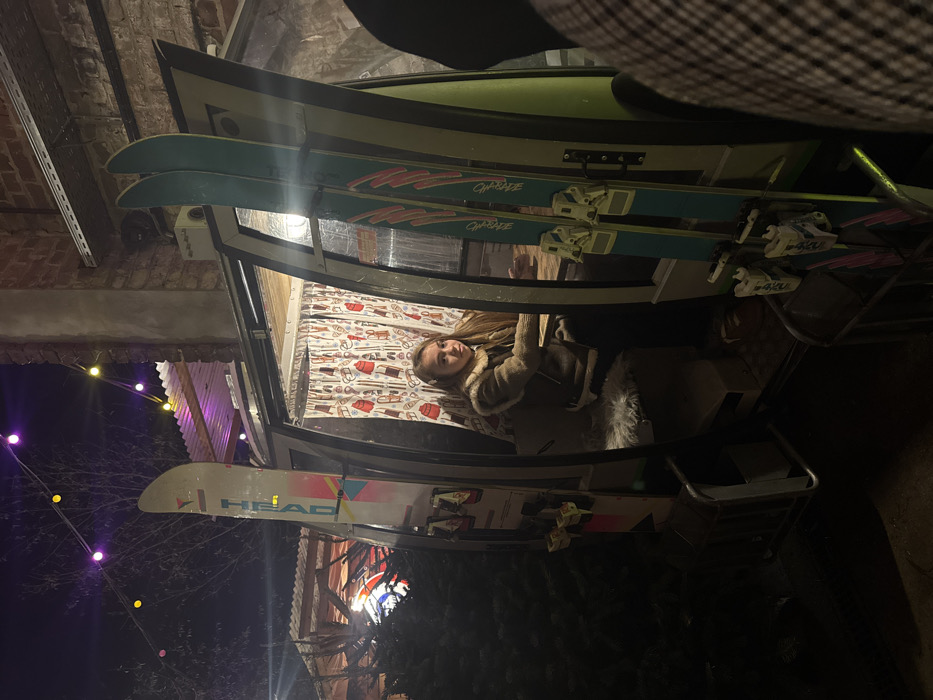 A woman with long blonde hair and a tan jacket lies on a cushion with a beige pattern under what appears to be stacked canoes and skis. Two pairs of light blue skis with red and black text are on top, while a pair of white HEAD skis with pink, light blue, and yellow markings are on the bottom. Colored string lights hang in the darkness nearby.
