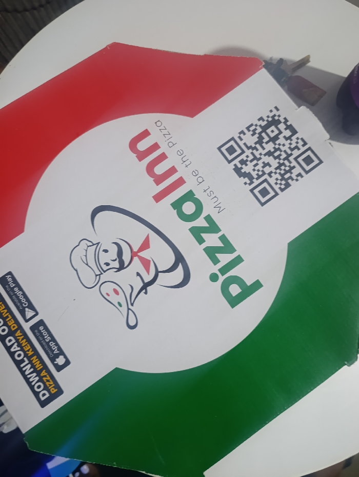 A pizza box from Pizza Inn features a white background with red and green curved sections at the top and bottom, respectively. The "Pizza Inn" logo is prominently displayed in green and red, accompanied by the tagline "Must be the Pizza". A cartoon chef character is included. A QR code is placed near the top edge. The box also includes download options for the Pizza Inn Kenya delivery app from the Google Play Store and the Apple App Store.