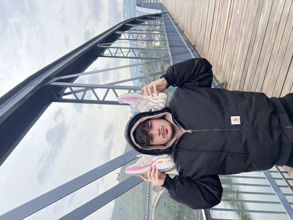 A young adult male stands centrally on the wooden deck of a metal truss bridge in Peso da Régua, Portugal. He wears a black Carhartt hooded puffer jacket over a light pink hooded sweatshirt. His dark, curly hair is visible beneath the hood, and he has a light mustache and goatee. He holds a pair of light beige and pink athletic sneakers, one in each hand, above his head, creating the appearance of ears. The bridge's dark grey metal structure frames the background. To the left, a river, likely the Douro, flows below, with a green buoy visible, and a stone arch bridge spans the river in the mid-distance. Beyond the bridges, terraced green hills characteristic of the Douro wine region rise under an overcast sky. The metal truss bridge extends into the background on the right, with more distant hills visible.