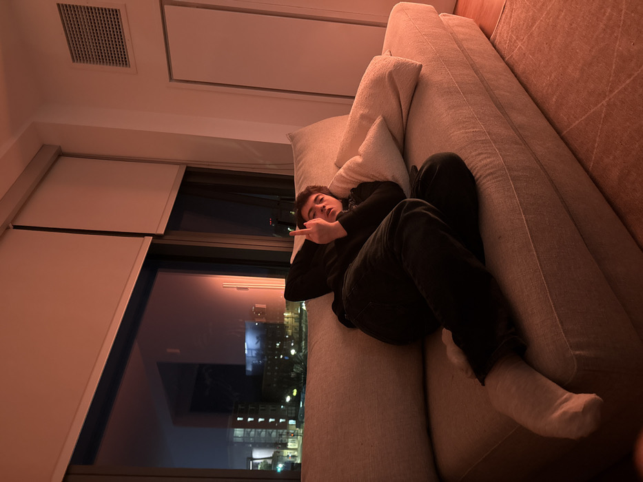 The image depicts an indoor residential scene at night, likely an apartment or condominium located in Boston, Massachusetts, United States of America. The room is illuminated by a warm, reddish-orange ambient light. A young male individual is centrally positioned, reclining diagonally on a large, light-grey upholstered sofa. He is dressed in dark-colored clothing, including a long-sleeved top and trousers, and wears white socks on his feet. His head rests on a light-colored pillow, with his right arm bent behind it. His left arm is raised, and his hand is positioned to display the middle finger directly towards the viewer, while his gaze is directed at the camera. Two additional light-colored pillows are visible on the sofa. Behind the individual and the sofa, a large window occupies a significant portion of the wall, revealing a night cityscape. Through the window, illuminated multi-story buildings and streetlights are visible, indicative of an urban environment. White roller blinds are partially retracted at the top of the window frame. To the right of the window, a white wall features a rectangular air vent near the ceiling and a tall, white panel door or closet structure. A light-colored rug with subtle geometric patterns covers a section of the floor in the foreground.