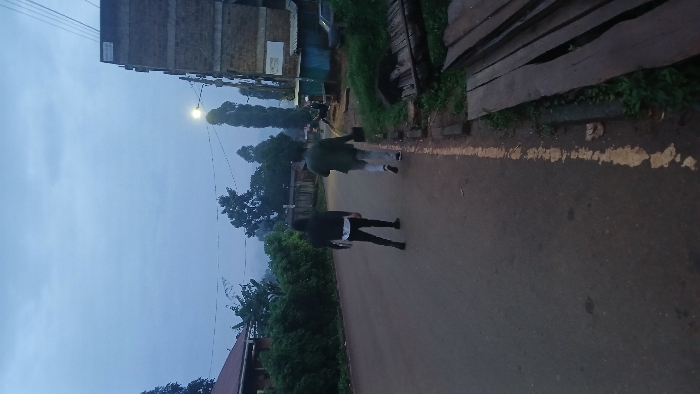 The image depicts an urban street scene in Kisii, Kenya, under dim, overcast lighting, suggesting either dawn or dusk. Two individuals are prominently visible from behind, walking away from the camera along the paved road. The person on the left wears a dark jacket over a white undergarment, dark trousers, and dark shoes. The person on the right wears a dark green jacket, light-colored trousers, and dark shoes with white soles, carrying a dark rectangular object in their right hand. The road surface is dark asphalt, marked by a faded yellow line along its right edge. To the right of the road, a dirt and grass verge contains a stack of dark wooden planks. Further right, a multi-story building constructed with dark brick or block rises, featuring exposed concrete bands. Adjacent to this structure are smaller, single-story buildings or kiosks with corrugated iron roofs, painted light blue and green. A partially visible dark vehicle is present near these smaller structures. A street light on a utility pole illuminates brightly on the right side of the frame, with power lines visible overhead. To the left of the road, dense green foliage obscures much of a building with a reddish-brown tiled roof. The background features additional trees and a hazy, indistinct landscape under the cloudy sky.