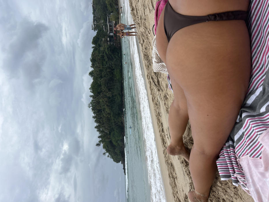 A beach scene shows a person lying on a striped towel, wearing a brown bikini bottom