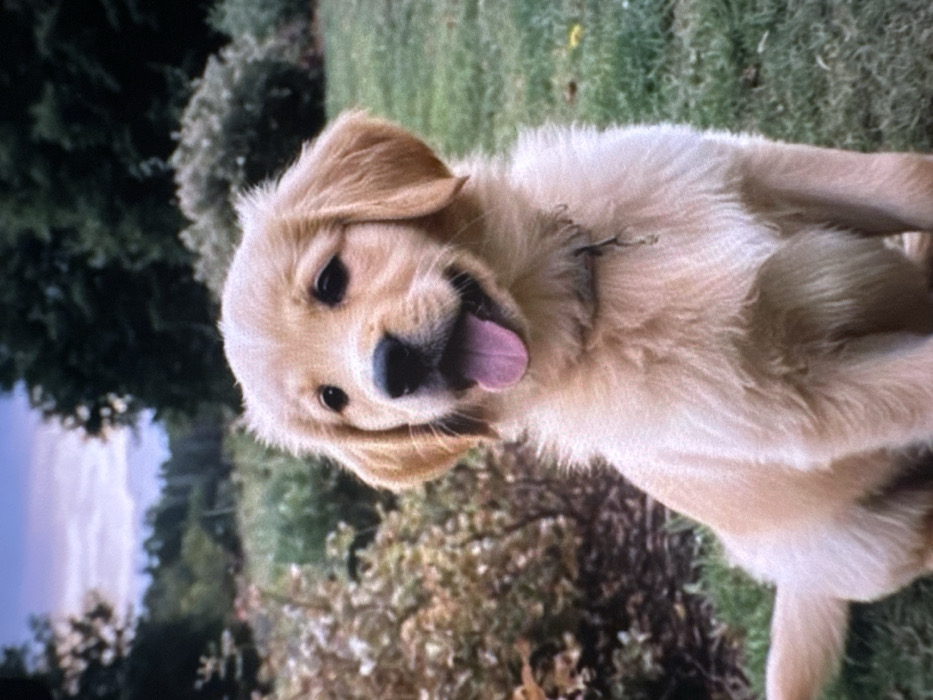 - "A light-gold to cream-colored Golden Retriever puppy is depicted seated on a grassy surface, oriented in a three-quarter view, facing slightly right with its head turned towards the right side of the frame" by FM-clbjN2, licensed under CC BY 4.0