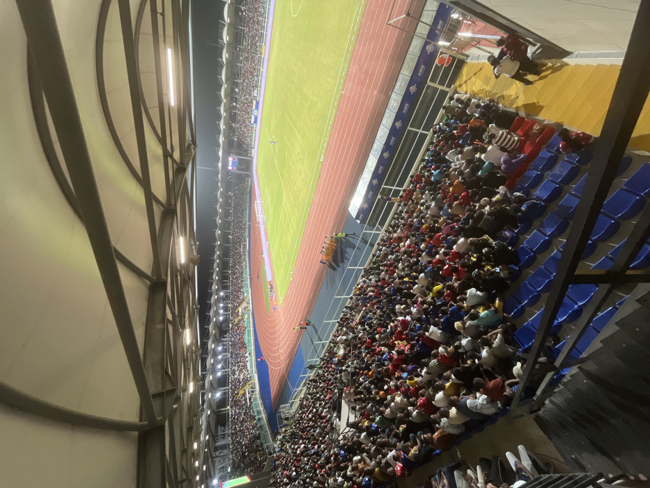 A stadium packed with spectators. A running track surrounds a green field. Stadium lights illuminate the crowd. The seating area is filled with people, many wearing hats and colorful shirts. The seats are primarily blue. A structure with white walls and metal supports flanks the stadium.