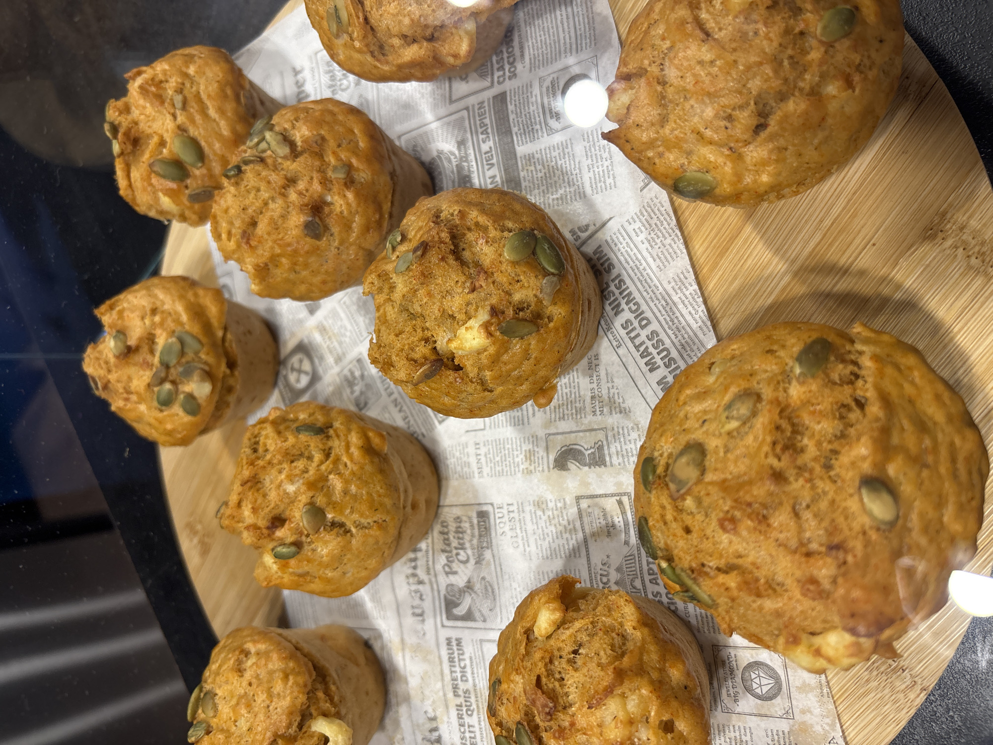 close-up, high-angle view of nine baked goods, possibly muffins or scones, arranged on a wooden surface covered with paper that resembles newspaper print. The baked goods are round, golden-brown, and sprinkled with green seeds, likely pumpkin seeds. The paper has text in various fonts and designs. The scene appears to be indoors, possibly in a bakery, cafe, or display case. The image includes a reflection, possibly from glass, suggesting it was taken through a window or display case. There is no mention of Sofia, Bulgaria or any other specific location.