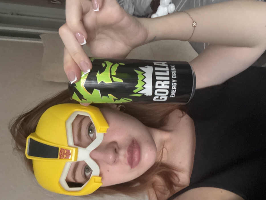 A person wearing a yellow and white mask with a red Transformers logo on the side holds a black and green can of Gorilla energy drink above their head. They have light skin, red hair, and green eyes. Their nails are painted with a French manicure. A gold bracelet with a star charm is visible on their wrist. A white teddy bear sits in the background. They are wearing a black tank top.