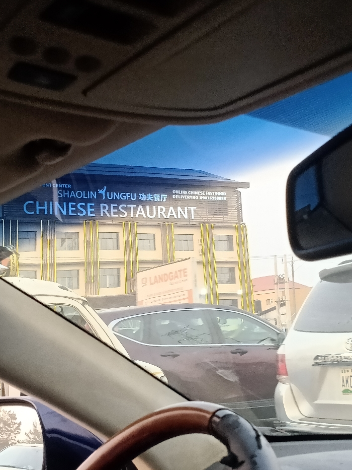 The image, taken from inside a car, shows a "Shaolin Kungfu Chinese Restaurant" building