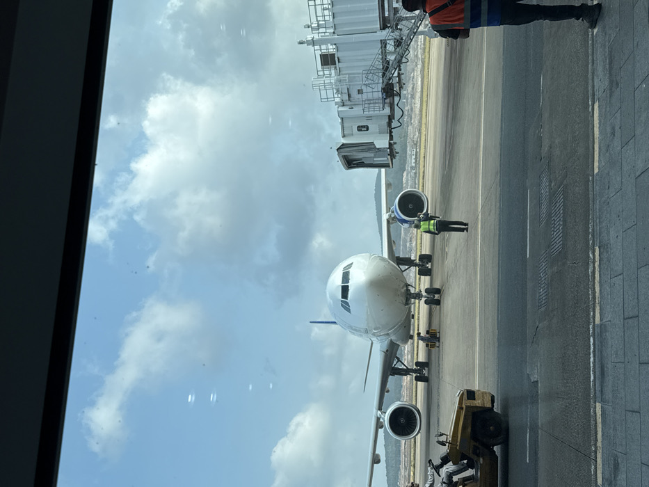 An airplane is parked on an airport tarmac beneath a partly cloudy sky. A jet bridge connects the plane to the terminal. Two ground crew members are visible: one inspecting the engine and another near a ground support vehicle. A person in a high-visibility vest and another individual stand on the right side of the frame. The scene is viewed through a window, partially obscuring the left side.