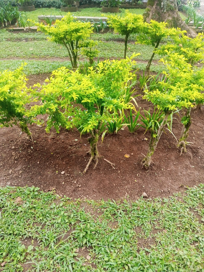 The scene depicts a landscaped garden bed located in Nghĩa Đồng Commune, Vietnam. A strip of green grass occupies the immediate foreground. Beyond this, a prominent bed of dark reddish-brown soil contains numerous ornamental plants. The primary subjects are approximately fifteen to twenty small shrubs, characterized by dense clusters of bright chartreuse-colored leaves, visible gnarled root structures, and slender, moss-dusted woody stems. Interspersed within the bed are several upright, spiky green plants. The soil is exposed between plantings, with minimal organic debris. The background reveals a manicured lawn, the base of a larger tree trunk on the right, and indistinct landscaping elements further away. No persons or overt activity are present.