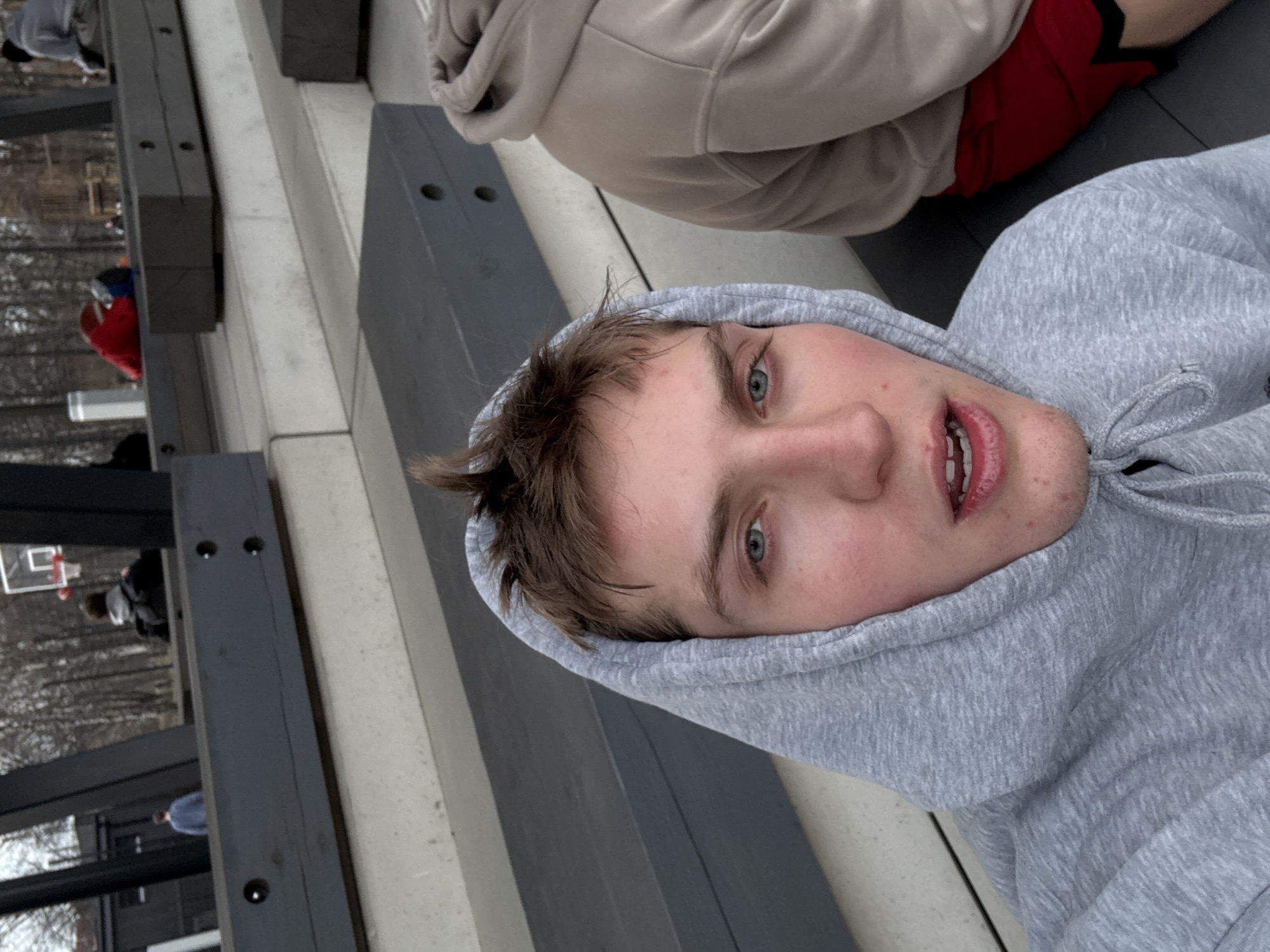 A medium, angled shot captures a person in a grey hoodie, looking directly at the camera. A second person, wearing a beige hoodie and red shorts, is situated behind them. They appear to be seated on a series of grey benches. In the background, a partially visible basketball hoop and figures suggest an outdoor recreational area. Given the presence of structures, possibly architectural elements or seating, and the proximity to outdoor activity, it suggests a public space within an urban context. However, the specific location in Riga, Latvia, is not discernible from the visual information provided.