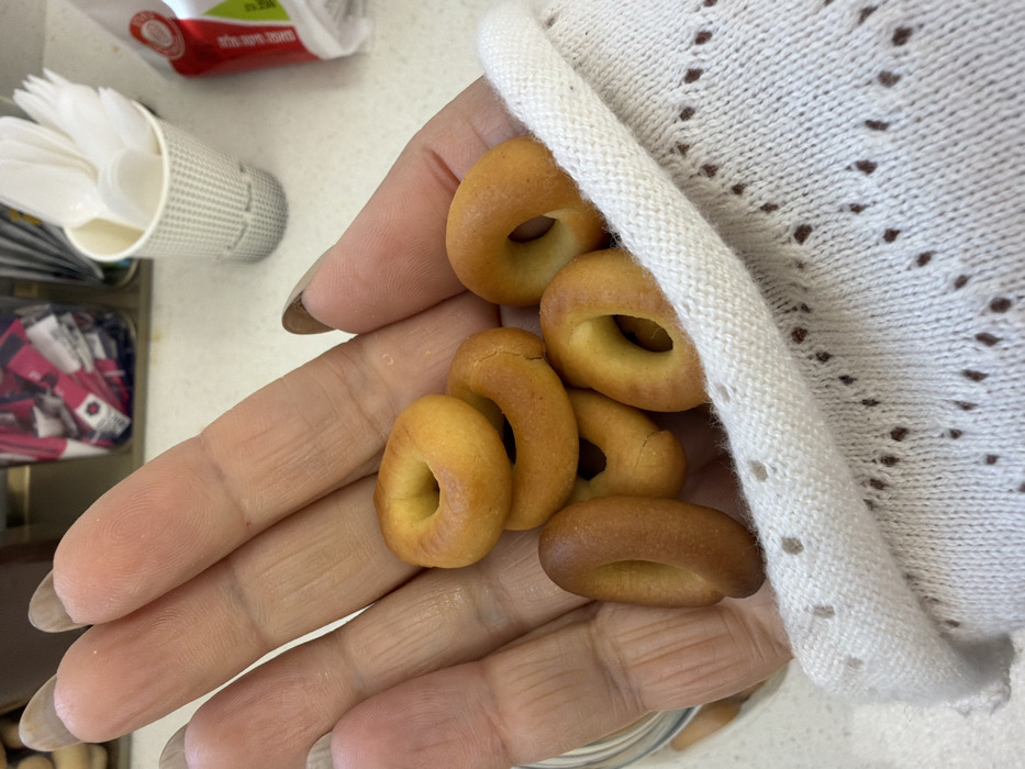 - "A close-up, high-angle shot depicts an individual's right hand cupped, holding approximately seven to eight miniature, golden-brown ring-shaped snacks, resembling small bagels or pretzel rings" by FM-grnl23, licensed under CC BY 4.0