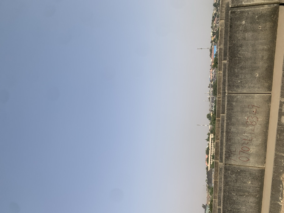 The image provides an elevated, panoramic view of Kugbo, Nigeria, under a hazy light blue sky. In the foreground, a series of worn, grey pre-cast concrete barriers extend horizontally across the frame. One barrier prominently displays the number "0704283-7" in a faded dark red or black hue, along with several circular indentations. Beyond the barriers, the midground reveals a dense urban landscape composed of numerous buildings with various roof types and colors, interspersed with green vegetation. Multiple tall, slender communication towers are visible rising above the buildings. The upper two-thirds of the image is dominated by a clear, cloudless, hazy light blue sky. No individuals, vehicles, or specific actions are present within the captured scene.
