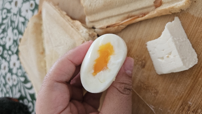 A close-up, high-angle view captures a meal setting. A fair-skinned human hand, primarily showing the thumb and two fingers, firmly holds a longitudinally bisected soft-boiled egg. The egg displays a solidified white albumen encasing a bright orange, partially liquid yolk. Below the hand and egg, on a light-colored wooden cutting board, rests an irregularly shaped, white block of cheese with a visibly crumbly texture. To the right and partially obscured, two toasted sandwich halves, cut diagonally into triangles, are arranged on the board. The sandwiches have a golden-brown exterior, and some internal reddish-brown filling is discernible. The wooden board is positioned on a dark green fabric surface adorned with a repeating pattern of white floral motifs. The scene is consistent with an indoor breakfast or light meal preparation. No visual elements within the image itself depict the city of Nuremberg, Germany.