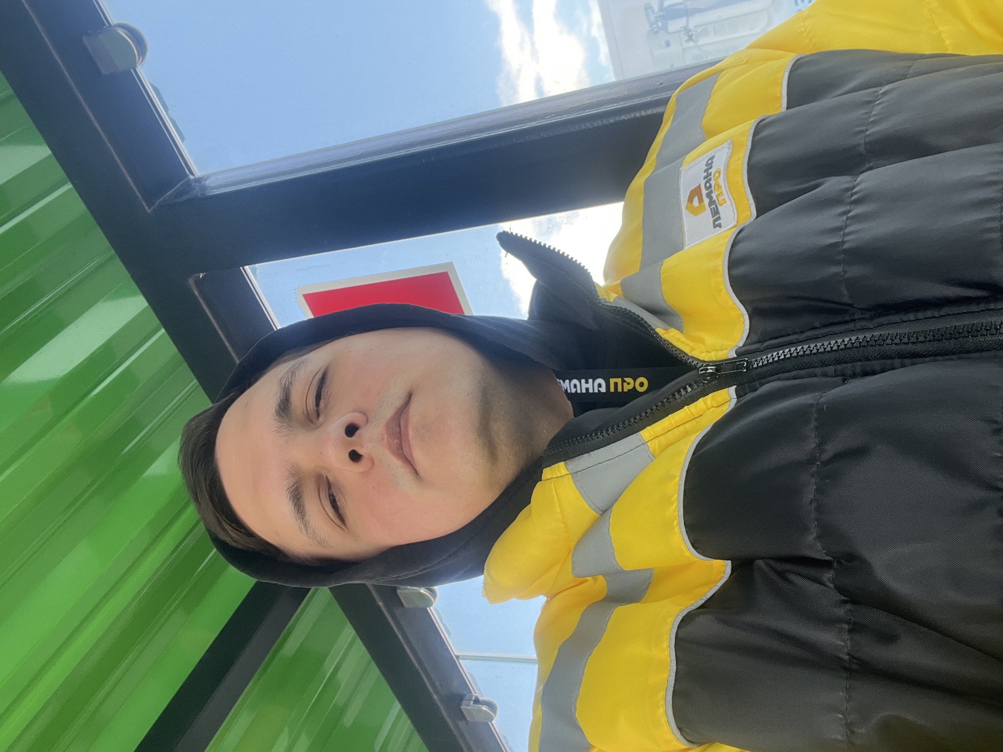A male individual is depicted in a close-up, low-angle shot, positioned within a structure. He wears a black hoodie beneath a black and yellow padded jacket with grey reflective stripes across the chest and shoulders. A white patch on the jacket's right side displays an orange-yellow logo and the Cyrillic text "ЛЕМАНА ПРО". A black lanyard with yellow Cyrillic text, partially visible as "ОМА НА ПРО", hangs around his neck. The subject's eyes are partially closed, and his expression is neutral as he looks towards the camera. The background features a bright green corrugated ceiling or awning in the upper left. To the right, a dark structural frame outlines a window revealing a clear blue sky with light cloud cover and the faint outline of a distant light-colored building. A rectangular red and white sign or sticker is partially visible behind the subject's left shoulder. The scene is located in the city of Ромашка Нп, Russia.