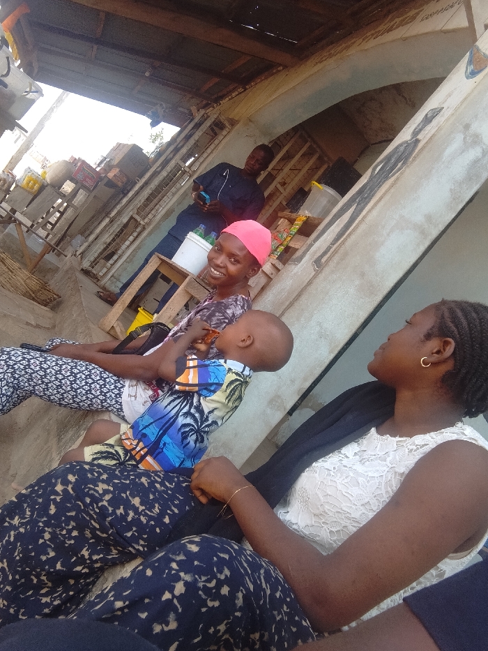 The scene depicts four individuals in a semi-outdoor commercial setting within Zango-ndaji, Nigeria. In the foreground, a young woman wearing a pink head covering and a patterned shirt is seated, smiling towards the camera. A young child, dressed in a colorful palm-tree patterned shirt, sits on her lap, holding a brown object to its mouth. To the right, a second woman with braided hair, wearing a white lace top and dark patterned trousers, is seated, looking to the right. In the background, a man in a dark blue shirt stands behind a wooden stall, holding a white mobile phone. The environment features a wooden overhead structure, merchandise displayed on tables, and a concrete pillar on the right with a dark, stylized human figure painted on it.