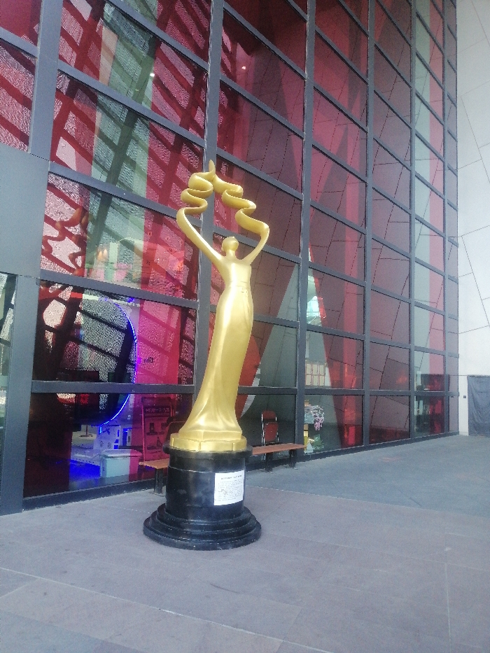 - "A large, golden, stylized statue of a female figure stands on a dark, multi-tiered circular base with a visible white plaque, positioned on a grey paved surface in Fengtai District, China" by FM-1OS812, licensed under CC BY 4.0