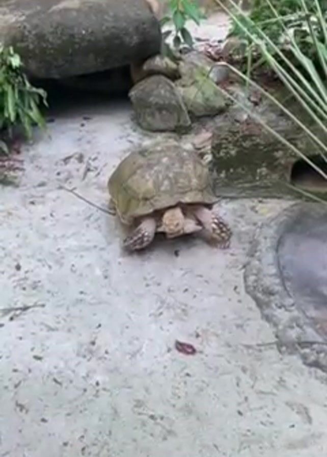 A tortoise is facing toward the camera while standing on a sandy-looking ground. There is foliage and rocks surrounding the tortoise. There is also a shallow water feature to the right of the tortoise. Sounds of people can be heard in the background.