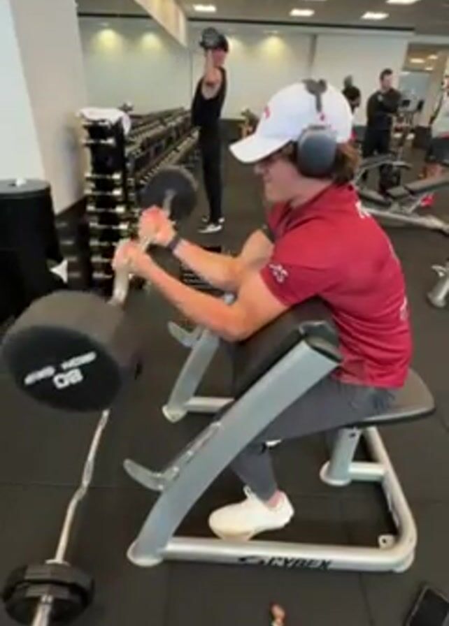 young man in a gym, seated at a preacher curl bench, lifting a barbell with 80 lbs plates. He is wearing a red long-sleeved shirt, gray pants, white sneakers, and a white baseball cap with ear protection. He is focused on his exercise, curling the weight. The gym has mirrors on the wall, racks of dumbbells, and other weightlifting equipment. Other people can be seen working out in the background. The floor is a light-colored tile. There's a black trash can and various workout accessories scattered around. The equipment brand appears to be Cybex.