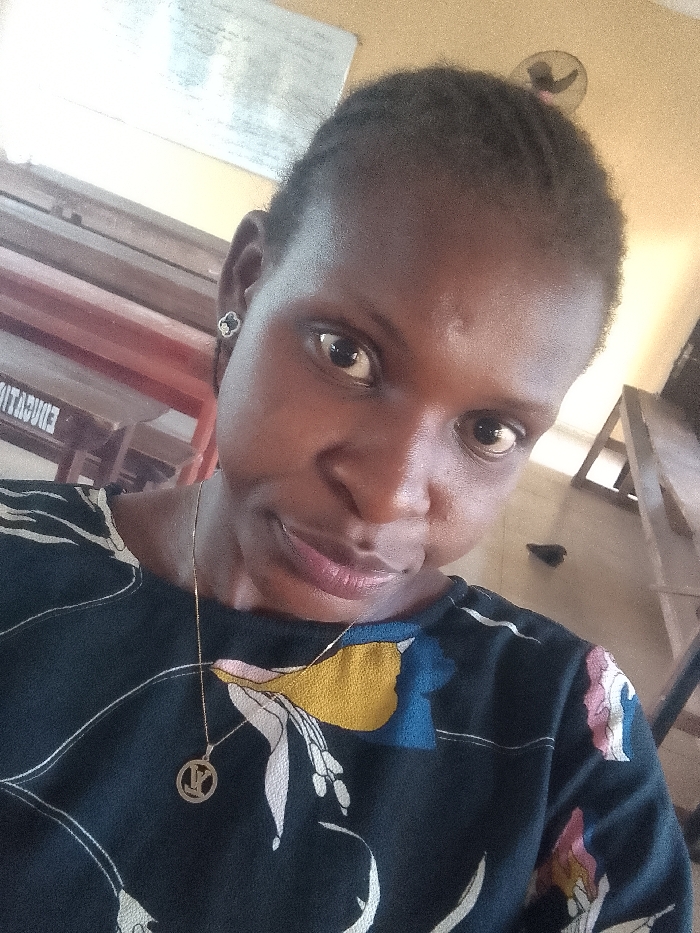 A dark-skinned woman poses close to the camera. She wears a black shirt with a floral pattern and a thin gold necklace featuring a circular pendant. Her hair is dark and pulled back. She has an earring in her left ear. The background is out of focus, showing what looks like a classroom or office setting with chairs. A ceiling fan is visible in the upper background.