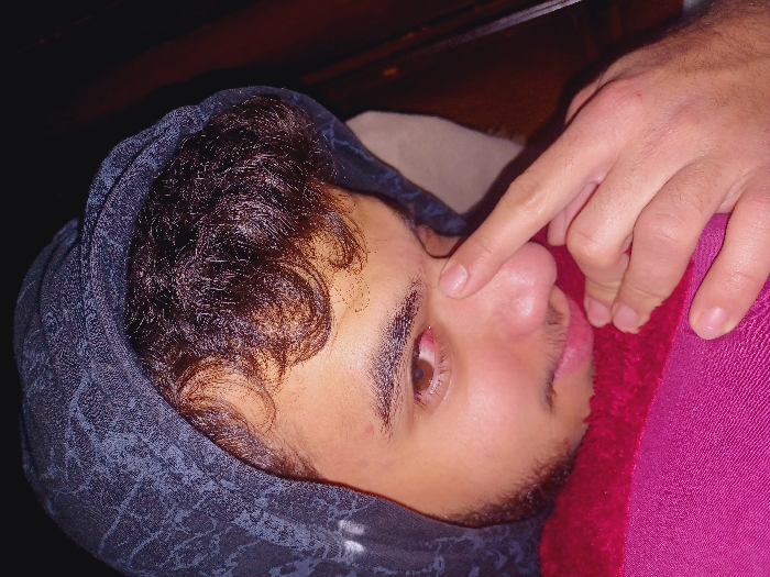 A person wearing a patterned head covering is lying down with a pink scarf or blanket near their face. Another person's hand is touching the nose of the person lying down. The individual's eyes are open, and they have curly hair. The skin appears light, and there is facial hair visible. The background includes dark areas and possibly a wooden surface.