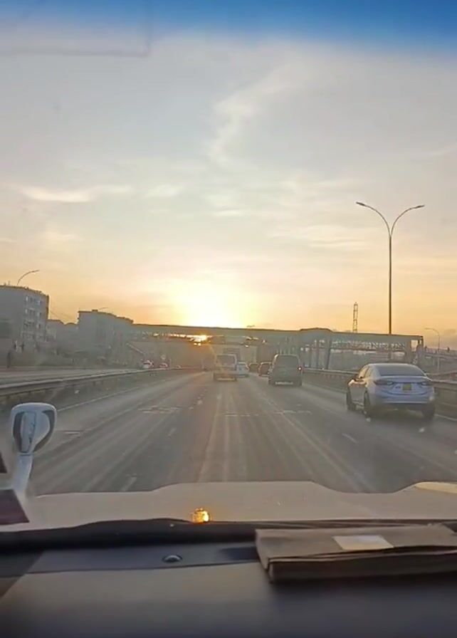 The view from inside a car driving on a highway reveals a bright sunrise ahead. Traffic is moderately busy with cars and vans visible. The sky is a mix of light blue and orange hues from the sun. An overhead pedestrian bridge crosses the highway. The car's dashboard is in the foreground, with a small booklet resting on it.