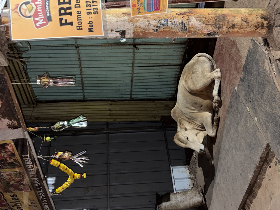 A cow is laying on a concrete surface next to a corrugated metal structure. Above, there are hanging decorations, including yellow garlands and silver tinsel. A sign for "Mumb Vadapav" with "FREE Home Delivery" and contact numbers is partially visible at the top. The scene also includes portions of other signs, one mentioning "Yoga Manda Goa" and another referring to "ables dealer 98737552(9607019891".
