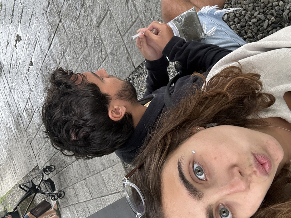 The scene depicts two individuals seated outdoors in Yuanshan, Taiwan, on a ground surface composed of small, dark gravel. In the foreground, a female with long, wavy brown hair and green eyes looks directly at the camera with puckered lips. She has a small, light-colored jewel below her left eye, clear-framed eyeglasses resting on her head, a small light-colored earring on her left ear, and a thin silver chain visible on her neck. She wears a light-colored, fleece-like top. Behind and to her right, a male with dark hair and a beard is seated, facing away from the camera towards the right. He wears a dark zippered hoodie over a lighter shirt and ripped, light-colored shorts. His right hand holds a small, white, hand-rolled object. A clear plastic bag containing a dark green, leafy substance rests on his lap. The background shows a paved area with wet-appearing gray rectangular stone pavers laid in a staggered pattern. Partially visible in the background are parts of a black, four-wheeled stroller or walker and the lower legs of another person wearing sandals.