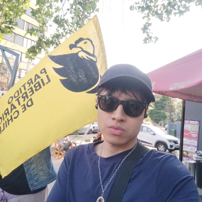 - "A young man wearing sunglasses, a dark blue shirt, and a cap stands in front of a yellow flag featuring a black bird graphic and the text "PARTIDO LIBERTARIO DE CHILE" by FM-ZqBmD2, licensed under CC BY 4.0