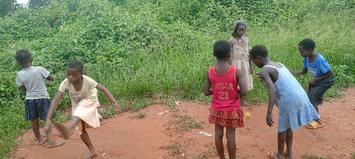 Six young children play outside on a reddish-brown ground in front of a grassy area