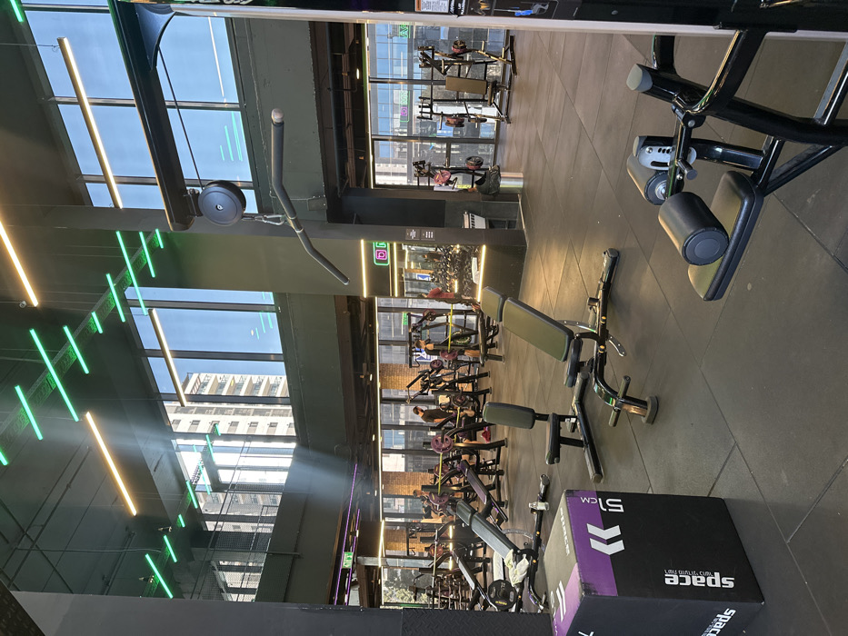 The image displays the interior of a modern, spacious fitness center, identified as being in Beer Yaaqov, Israel. The facility features a dark, rubberized floor and a high ceiling with exposed ductwork and numerous linear LED light fixtures, some emitting green and others warm white illumination. Large, floor-to-ceiling windows span the upper and lower levels, allowing natural light to enter and reflecting exterior multi-story buildings. In the foreground, a black plyometric box with purple accents and "SPACE 51 CM" branding is visible on the left. Centrally, two black adjustable weight benches with dark green padding are positioned on the floor. On the far right, a portion of a black exercise machine with padded rollers is partially visible. The mid-ground and background are populated with various exercise equipment, including multiple weight benches, barbell racks laden with purple and black weight plates, and diverse weight machines such as chest presses and leg presses. Approximately eight to ten individuals are present, distributed across the gym floor. Several are actively using equipment, while others are standing or moving between stations. A large black structural column stands prominently on the right, from which a lat pulldown cable system extends. Illuminated green and pink square signs are visible on the far walls, and a silver trash can is situated near a column.
