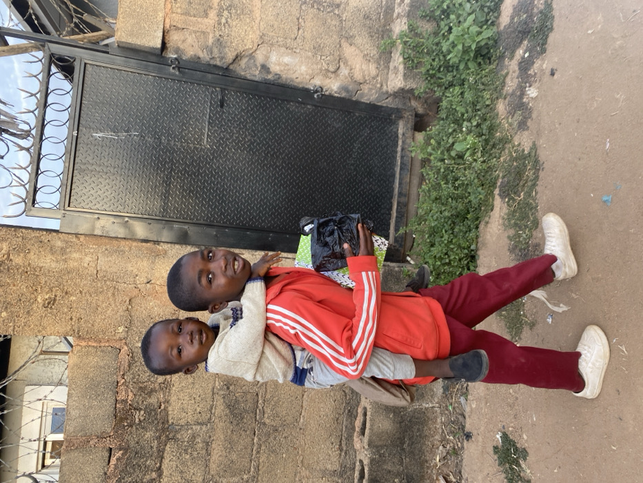 Two young boys pose together, one piggybacking the other. The boy on top wears a red jacket with white stripes down the sleeves and holds a black bag. He also wears maroon pants and white sneakers. The boy below sports a light tan sweater over a blue shirt and black shoes. They stand in front of a gray wall with a black metal door and some greenery.