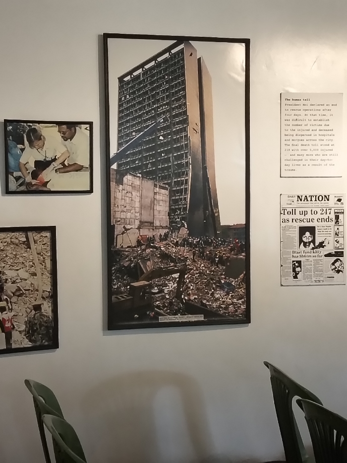 The image displays an interior wall of an exhibition space, featuring multiple framed photographs and text panels detailing the aftermath of the 1998 US Embassy bombing in Nairobi, Kenya