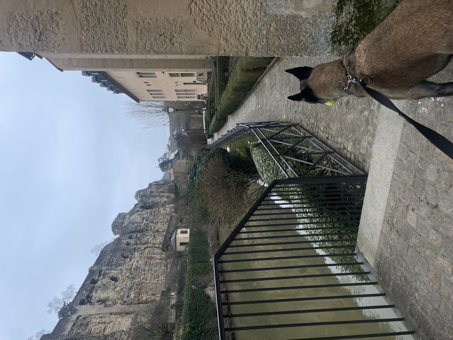 A tan-colored, short-haired dog, possibly a Belgian Malinois, is depicted from behind, walking on a cobblestone path. The dog wears a metal choke collar with a tag, a black leash, and carries a bright yellow tennis ball in its mouth. To the left, a dark metal railing overlooks the murky, olive-green Alzette River. Across the river, imposing, weathered rock cliffs, part of the Bock Promontory/Casemates, rise steeply, featuring natural erosion and small structures nestled at their base. Sparse, bare vegetation clings to the cliff face. To the right of the path, a second dark metal fence borders a landscaped area with manicured hedges and patches of snow on the ground. Beyond this, a multi-story, light-colored stone building with a dark roof and numerous windows stands. In the distant background, an arched stone bridge spans the river, with additional buildings visible on the elevated terrain. The sky is overcast and uniformly grey. The scene is located in the Grund district of Luxembourg City, Luxembourg.