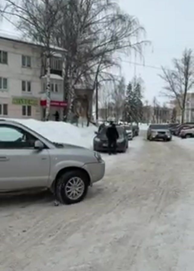 street covered in snow, lined with parked cars and a building with a pharmacy ("apteka") sign. A silver Hyundai Tucson drives down the street, passing a group of people gathered around another car. The weather is overcast, and bare trees are visible in the background. The scene is quiet, with no audible sounds other than the possible faint sounds of the car engine.