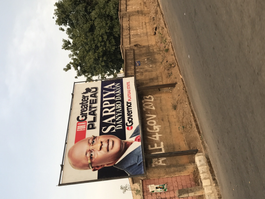 A political campaign billboard dominates the center-left of the image, displaying a headshot of a bald man wearing glasses, a dark suit, and a red tie. The billboard features the slogan "FOR A Greater PLATEAU" in large white and red lettering, above the name "SARPIYA DANYARO DAKON," and "FOR Governor PLATEAU STATE." The billboard stands on two dark metal posts affixed to a low, light brown concrete wall, partially covered in dirt or dust. White graffiti on this wall reads "A LE 4 GOV 2023." To the far left, a smaller, tattered green-and-white poster is attached to a red-brick structure. A two-lane asphalt road, dark gray in color, occupies the foreground, leading towards the upper left. Behind the concrete wall and to the right, a large, dense green tree with numerous leaves is visible under a pale, hazy sky. This scene is located in the city of Jos, Nigeria.