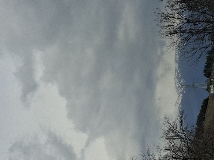 The image presents a panoramic landscape in the vicinity of Mihiltsi, Bulgaria, captured under a heavily overcast sky dominated by dense, dark grey clouds. In the mid-ground, a towering metal lattice power pylon, light grey in color, stands centrally against a backdrop of distant mountains. These mountains feature dark blue lower slopes and show irregular patches of white snow on their upper ridges. The immediate foreground is framed on both the left and right by the bare, dark branches of dormant deciduous trees. The ground beneath the pylon and trees is a mix of dry, light brown earth and sparse vegetation, exhibiting a gentle incline. A small, partially obscured structure with white and green elements is visible at the base of the power pylon. No individuals or overt activities are present within the frame.
