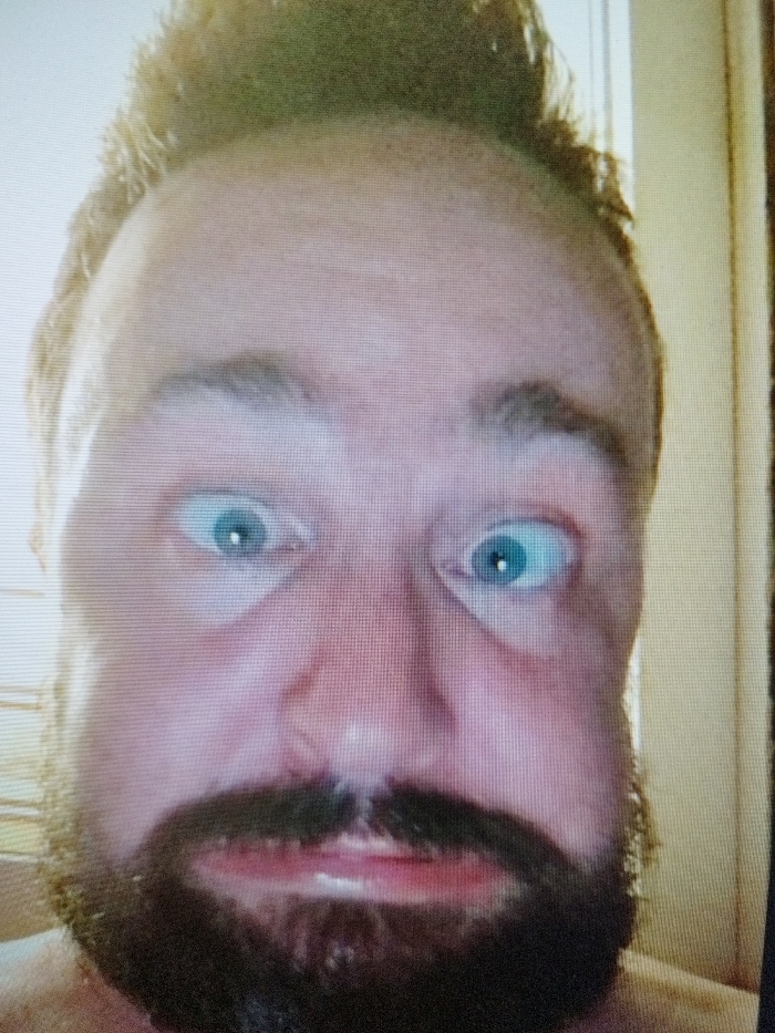 An adult male with light-colored, upward-styled hair and a dark full beard and mustache is depicted in a close-up, chest-up shot. He directly faces the camera with a wide-eyed, startled expression, revealing prominent blue irises. His mouth is slightly open, lips parted. His cheeks appear somewhat distended. The background is an indistinct indoor setting, primarily light-colored, with a dark vertical line on the far right. The image exhibits visible pixelation, suggesting a digital photograph, possibly of a screen. The specific location in the city of Strasbourg, France, cannot be determined from the visual information provided.