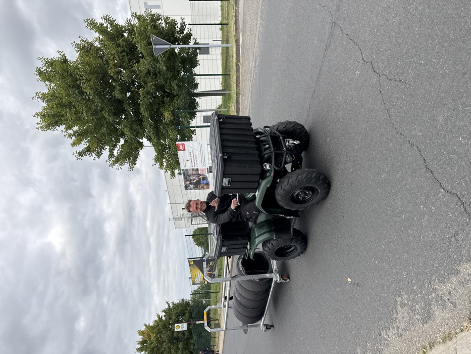 A male individual is observed on a dark green All-Terrain Vehicle (ATV) on an asphalt road in Oberlungwitz, Germany. The man, with short light-colored hair and stubble, wears a long-sleeved black top and dark pants, smiling and looking towards the viewer while making a "shaka" hand gesture with his right hand. The ATV is equipped with two black, ridged utility boxes, one on the front rack and one on the rear rack, and features a visible winch on its front. A silver-colored metal trailer is hitched to the rear of the ATV, carrying approximately eight black cylindrical objects, likely tires or drums, stacked horizontally. The trailer has small orange wheels visible on its right side. The scene is set outdoors under an overcast sky. In the background, a large, white industrial-style building is visible, fronted by a green metal fence. To the right of the fence, a large deciduous tree with green foliage stands. Various signs are present: a prominent white sign with red and black text for "AWG" advertising job opportunities for a logistics center in Hof and Plauen, and a partially visible yellow and black sign. On the far left, a circular white 'H' in a green circle, indicating a bus stop, is visible. The asphalt road surface exhibits minor cracks.
