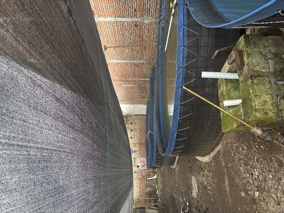The image displays an outdoor aquaculture facility located in Tambakrejo, Indonesia. A large, dark gray mesh shade net, supported by blue ropes, covers the entire visible area, providing overhead shade. Four distinct circular aquaculture tanks are arranged in a curved line from the foreground to the background. Each tank consists of a dark-colored exterior frame, likely reinforced, containing a blue tarp liner filled with water. White PVC pipes, consistent with aeration or water circulation systems, are partially visible within and around the tanks. The facility's perimeter features a red brick wall with white mortar lines along the right side and background, and a lighter-colored wall section further back on the left. The ground is uneven, exposed dirt with sparse debris, including small pieces of wood, scattered particularly on the left. In the foreground, slightly off-center to the right, a moss-covered concrete block structure is present. A brass-colored metallic rod with a valve or connector assembly leans against this structure, near additional white PVC pipes. In the far background, a single individual wearing a light-colored shirt and dark trousers stands near the left wall, their specific action unidentifiable. Further left in the background, a wooden slatted fence or structure is visible.
