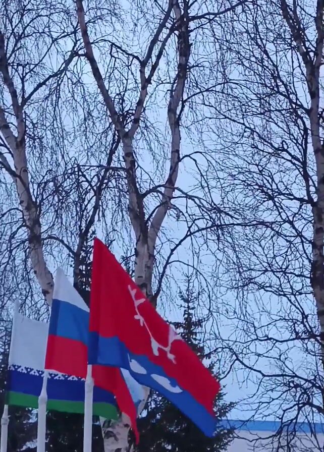 three flags waving in the wind, presumably outdoors. The flag on the left is white, blue and green horizontally, with a vertical white stripe to the left. The middle flag is the Russian flag, with horizontal stripes of white, blue, and red. The flag on the right is red, blue, and red again with two reindeer-like figures in white. The flags are set against a backdrop of leafless trees under an overcast sky. A person’s voice can be heard in the background.