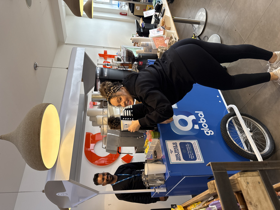 The image depicts an indoor scene at the Global headquarters, located at 30 Leicester Square, London WC2H 7LA, United Kingdom. In the foreground, a woman of mixed ethnicity, with curly brown hair secured by a leopard print headband, a black hoodie, black leggings, and white sneakers, leans over a blue mobile coffee cart. She is smiling broadly towards the viewer, holding a white cup with the "q global" logo near the coffee machine on the cart. To her left, a man of South Asian ethnicity, wearing glasses, a dark shirt with a blue lanyard, and a beard, stands behind the cart, also smiling towards the viewer. The blue coffee cart is a two-wheeled trike-style unit, branded with the white "q global" logo on its side. It features a prominent white sign stating "THIS TRIKE IS RELOCATING From Thursday 26 March you can find me on the Terrace. Also serving your usual hot drinks and snacks. So please come and see me." The cart's surface holds an espresso machine, various metal pitchers, disposable cups with the "q global" logo, a container with green liquid, and coffee accessories. The background features a white wall with a large, stylized red "G" logo and the word "global" in red. Overhead, distinctive, textured pendant light fixtures hang from the ceiling. A light-colored floor is visible, along with a table and other elements of an office environment to the right.