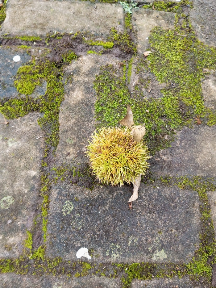 A spiky, pale yellow-green burr lies on weathered, moss-covered bricks
