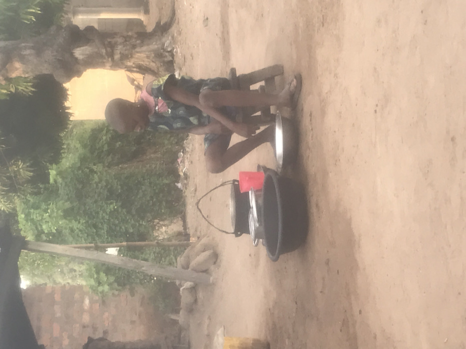 A child sits on a small wooden stool, elbows on knees, looking down at metal bowls. A large, black plastic basin sits nearby with a metal bucket and red cup inside. The scene is outdoors, with a dirt ground and glimpses of foliage and a brick structure in the background. The photo is taken at an angle.