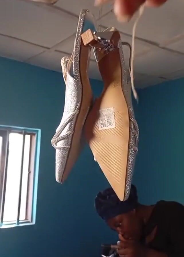 A pair of high-heeled silver shoes dangle from a string attached to the ceiling. The ceiling is made of square panels with a rectangular stain on one. A person stands below the shoes, wearing a black shirt and a blue head covering, and is attending to the hair of a person who is out of view. To the left of the shoes is a window with metal bars. The wall is painted a teal color. A hand holding the string is visible above the shoes.