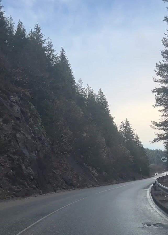 A forward-facing view from inside a vehicle driving on a paved road, the surface of which is wet, shows a view of a tree-lined mountain pass under a blue and pale sky with clouds and a moon. The car appears to be traveling slowly, and another car can be seen in the distance ahead on the road. The road has two lanes and is flanked on both sides by guard rails and steep hills covered in evergreen trees. Patches of bare rock are visible on the left hill.